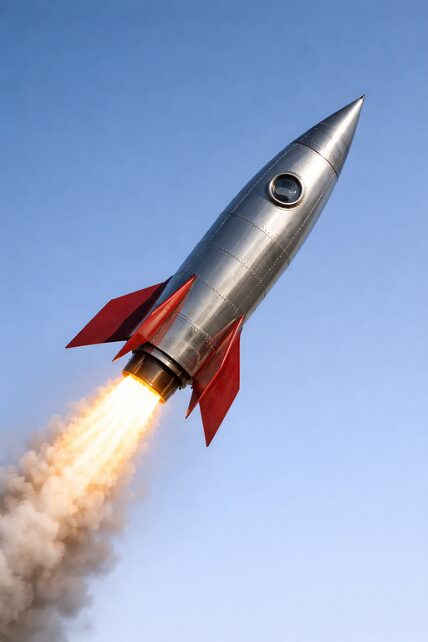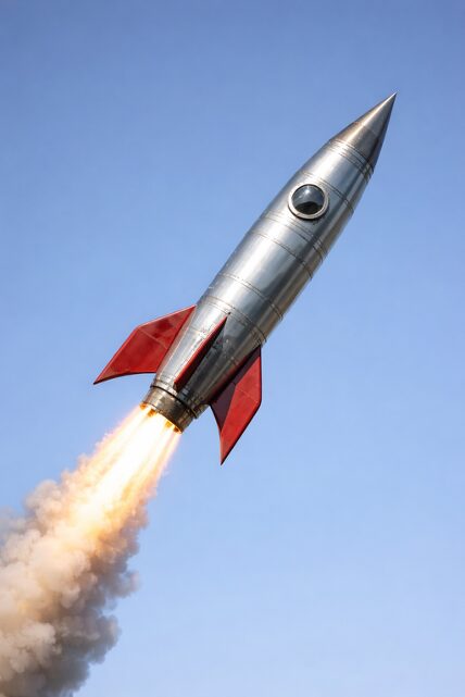 Prompt: A high-resolution, photorealistic image of a single rocket ascending at a precise 45-degree angle, nose pointing up and to the right. The rocket is fully visible in frame and occupies approximately 65% of the image width. Its body is made of brushed stainless steel with fine horizontal panel seams and visible rivets, exhibiting realistic specular highlights and subtle sky reflections. Three identical matte-red fins are mounted symmetrically near the base, slightly weathered and angled backward.