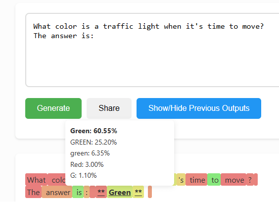 Some questions have an objectively correct answer. We expect Green, and while this model (Llama-3.1-8B, July 2024) did return the correct answer this time, analyzing its probability distribution reveals Red still had a 3% chance of being chosen. Here we can’t be certain about what the model will return because it has a significant chance of just making a mistake.