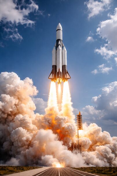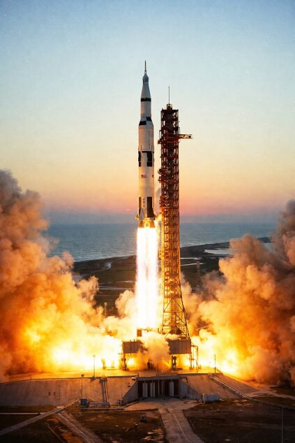 The rocket is photographed outdoors against a clear, pale blue daytime sky with no clouds, stars, people, text, logos, or additional objects. Sunlight comes from the upper left, while the flame plume casts a warm orange glow onto the lower fuselage. Depth of field is realistic with the entire rocket in sharp focus. Captured in a documentary-style photograph using a full-frame DSLR, 85mm lens, f/8, ISO 100, natural color grading, high dynamic range, cinematic realism.